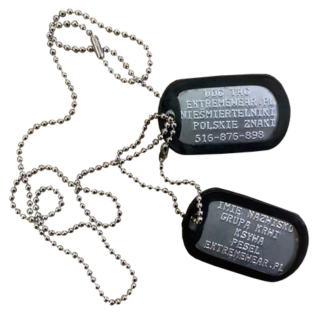 Nieśmiertelnik (dog tag) to dwie identyczne zawieszki, na których wybite są informacje pozwalające zidentyfikować żołnierza w przypadku śmierci lub odniesienia poważnych obrażeń. Dzisiaj nieśmiertelniki są wciąż chętnie wykorzystywane, również przez osoby niezwiązane z wojskiem – w Extreme Wear oferujemy wysokiej jakości zawieszki, na których możemy wybić dla Ciebie dowolny tekst, w tym ważny cytat czy też motto.