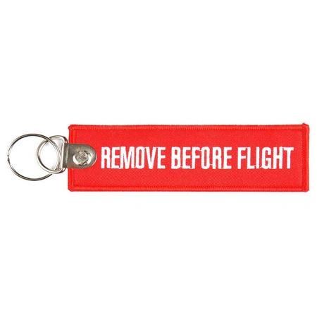 Brelok Remove Before Flight (front i tył), wykonany metodą tradycyjnego wyszywania.