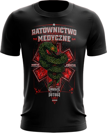 Prezentowana koszulka jest przeznaczona dla ratowników medycznych. Przedstawia napis RATOWNICTWO MEDYCZNE i przyciąga uwagę ciekawą grafiką. Jest doceniana nie tylko za wygląd, ale zdobywa dobre opinie przede wszystkim za jakość wykonania, a więc precyzję kroju oraz materiał. Świetnie sprawdzi się jako prezent dla znajomego ratownika medycznego czy upominek wręczany w ramach szkolenia. Istotnym elementem nadruku jest napis semper paratus, co z łacińskiego oznacza zawsze gotowy. To podkreślenie faktu, że ratownik medyczny cały czas musi być w gotowości do ruszenia na pomoc potrzebującym.