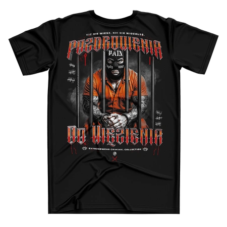 Z tyłu koszulki wizerunek mężczyzny za kratami – symbol życia według własnych reguł i wierności zasadom, które nie znają kompromisów. To nie jest dekoracja – to ostrzeżenie, że nie każdemu można spojrzeć w oczy bez strachu.
