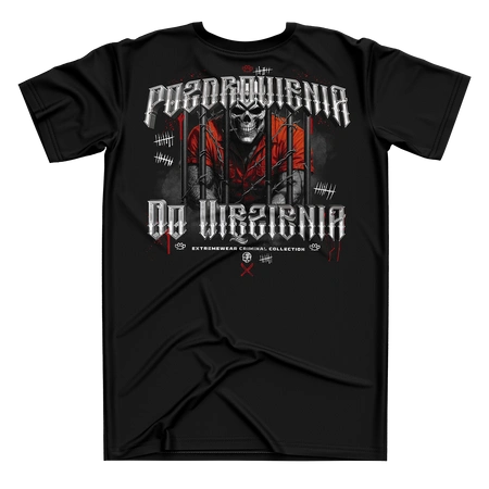 Na plecach wizerunek mężczyzny z czaszką za kratami – bezwzględny, nieugięty. „POZDROWIENIA DO WIĘZIENIA” – to nie tylko slogan, to realia świata, w którym zasady są jasne: nie mówisz, nie sprzedajesz. Ten motyw pokazuje, że wierność i lojalność są ważniejsze niż cokolwiek innego.